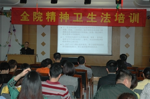 2012年10月26日,十一届全国人大常委会第二十九次会议,表决通过了《中华人民共和国精神卫生法》。为了更好的依法执业, 4月27日,由医务科组织全院医务人员学习精神卫生法,王东波院长、夏朝云副院长、汤庆平科长分别给大家讲解精神卫生法的相关内容,包括精神障碍患者的保障问题、精神障碍患者的诊断治疗问题以及医疗机构、心理卫生方面等诸多内容进行了阐述。通过学习培训,医务人员提高了对精神卫生法的认识,增强了依法执业的法律意识。