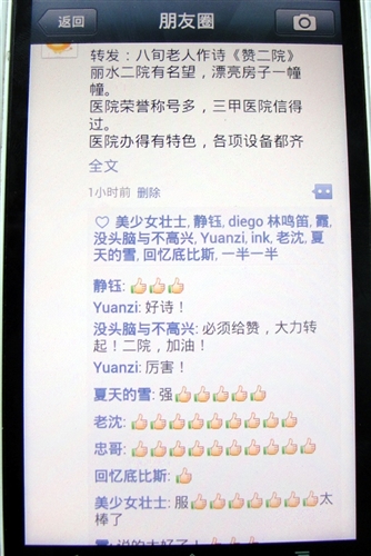 日前,一首名为《赞二院》的诗歌在医护人员的微信朋友圈里流传着,引来众人纷纷点赞、评论。 赞二院 丽水二院有名望,漂亮房子一幢幢。 医院荣誉称号多,三甲医院信得过。 医院办得有特色,各项设备都齐全。 开放床位有五百,医院职工好又多。 医患满意工作好,服务群众医德高。 全院职工付辛劳,再上台阶不骄傲。 原来,这是我院心身科病房患者家属吕阿姨所作。吕阿姨今年80多岁了,平时喜爱作诗来记录生活所思所感。她的老伴目前在我院心身科接受治疗。刚入院时,老人病情不稳定,吕阿姨十分担忧,经过一段时间的精心治疗与护理,病情已明显好转。有感于医院的服务质量,吕阿姨遂作诗《赞二院》。 看到吕阿姨的诗,医护人员都十分感动,这不仅是对我院医疗服务工作的肯定,更是对医护人员的信赖与鼓励。并激励着医务人员以更饱满的热情投入到工作中,为患者提供更优质的服务。