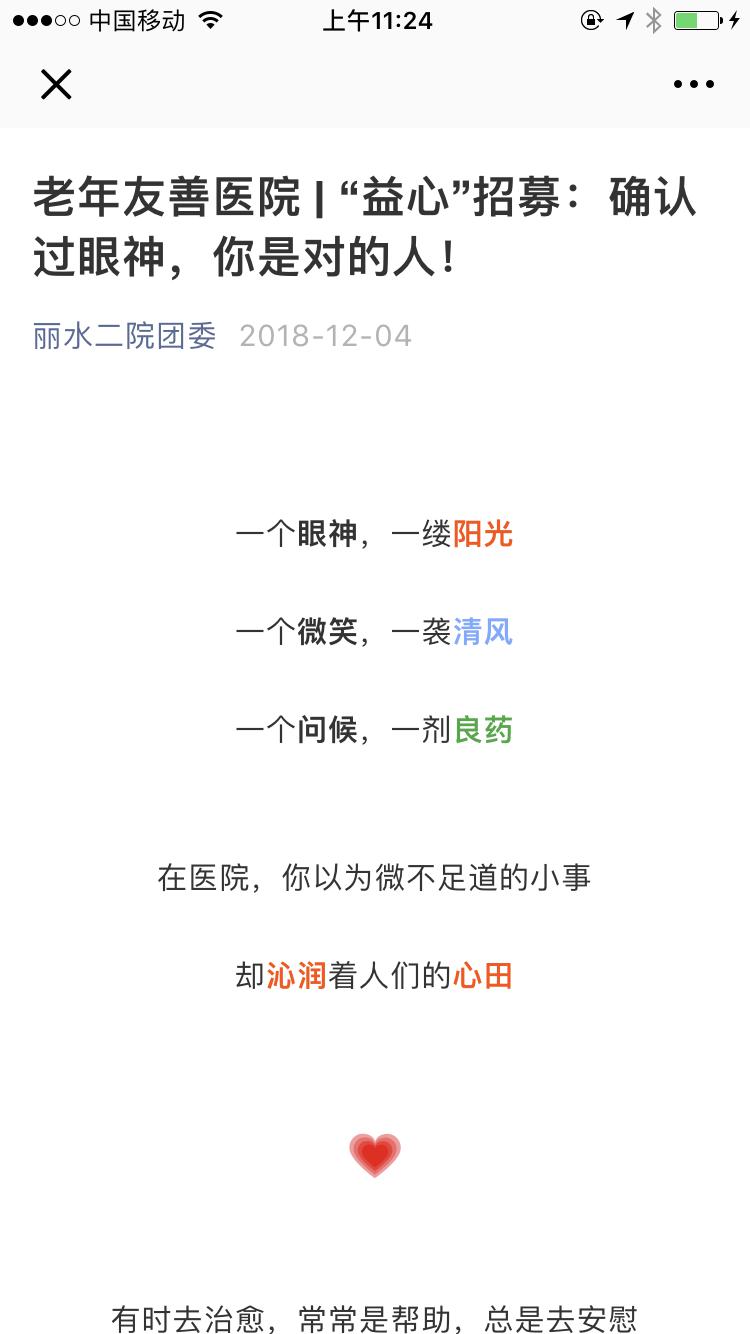 三、“益心”已有经验和荣誉声誉。为更好地服务患者,感恩社会,2007年丽水市第二人民医院成立了志愿服务队,2013年正式更名为“益心”志愿服务队;2.“益心”一词与“医心”、“一心”谐音:一是体现丽水二院为心理医院,二是表达医院党团志愿者一心一意做志愿服务,三是表达要将志愿服务益进人心;3.自服务队成立以来,打造了“爱心助学”、“梦想行动”、“敬老爱老,青春关怀”、“心理护航”等一系列志愿服务活动品牌,并相继获得“浙江省优秀志愿者服务集体”、“全市机关党组织优秀服务品牌”、“莲都区最美志愿服务集体”“浙江省卫生计生系统首届“最美志愿者”团队”等多项荣誉。