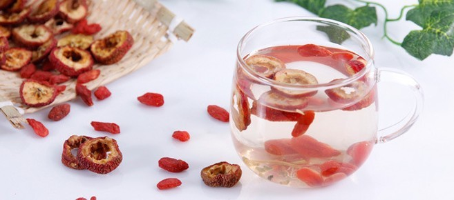 红枣枸杞山楂茶。取红枣3粒、枸杞10克、山楂10克、玫瑰10克、水1.5升;红枣、山楂去核;材料加水泡15分钟,大火煮开后用小火煮15分钟即可。本方可补肝肾、疏肝解郁、养血安神、消食健脾,适合体虚目涩、睡眠欠佳,兼有食积者饮用。