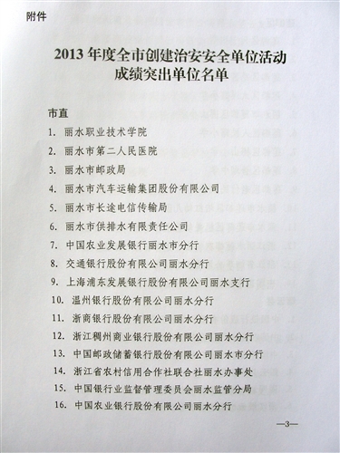 近日,丽水市公安局、丽水市社会管理综合治理委员会办公室联合发文(丽公发[2014]18号)表彰2013年开展创建“治安安全单位”活动成绩突出的单位,我院名列其中,成为市直医疗系统中唯一一家获此殊荣的单位。