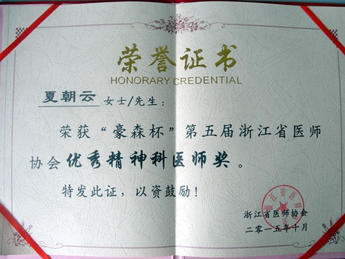 10月24日,“豪森杯”第五届浙江省医师协会优秀精神科医师表彰大会在丽水华侨大酒店召开。我院副院长、精神科主任医师夏朝云榜上有名,全省共8名医师获表彰。