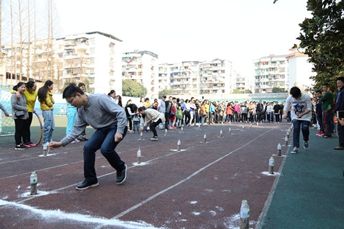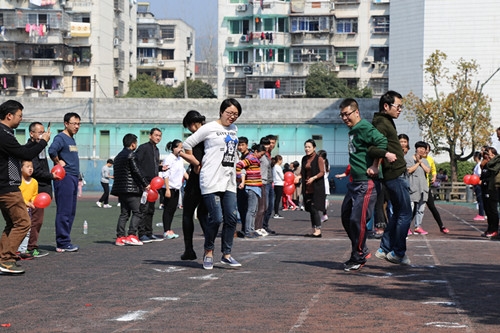运动项目分为集体项目和个人项目,集体项目有呼拉圈竞赛、“心心相印”、“抢收抢种”;个人项目为踢毽子、定点投篮、单人跳绳等。整个活动集体力、智力、趣味为一体。集体项目赛场上,参赛人员奋力拼搏,场下的拉拉队们亦是欢呼,加油,人人脸上都洋溢着快乐的笑容。比赛现场高潮迭起,整个操场变成了欢乐的海洋。