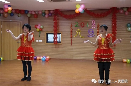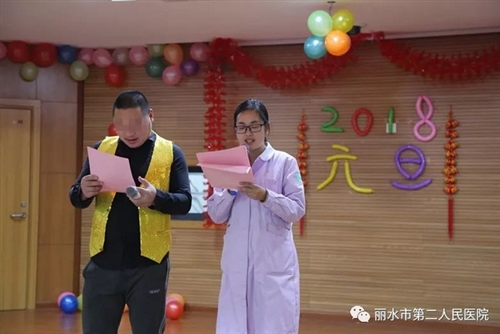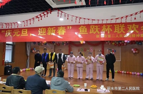 张灯结彩,贺新年。丽水市第二人民医院精神康复科在院领导的关怀下、在丽水市鱼跃酿造食品有限公司的大力支持下,在丽水学院志愿者的帮助下,为专科住院患者们准备了一场主题为“庆元旦、迎新春”的鱼跃杯联欢会。医院书记院长吴绍长、鱼跃公司副总王景弘等应邀出席,医护人员、护工与病友们欢聚一堂,共迎新年。