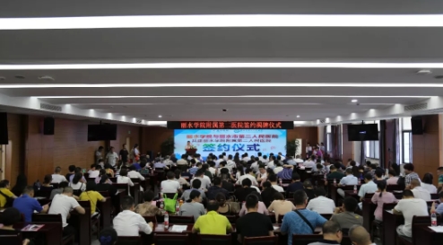 丽水学院校长肖刚、市二院院长吴绍长签订协议;丽水学院校长肖刚、副校长叶沙平,丽水市人民政府副秘书长吴郁郁、市二院院长吴绍长共同揭牌。
