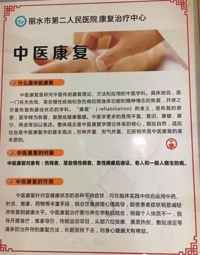 丽水市第二人民医院康复医学中心,是丽水市医学会物理医学与康复学分会主委单位。中心成立于2002年,现有工作人员57名,其中康复医师15名,康复治疗师18名,康复护士24名。分设治疗部和住院部,面积总计4408平方米,其中治疗部面积1208平米;住院部分设两个病区,合计床位110张。