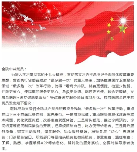 同时医院将开展“最多跑一次”改革争先进位大赶超活动,请百姓和医院各科室积极查找就医流程中以及本院职能科办理相关工作流程中存在的短板,上交提案;医院将根据收集到的提案进一步完善下半年“最多跑一次”改革责任清单,并分派各相关职能科进行分析整改,开展流程再造工作。年底,医院将表彰优秀提案,真正实现对外——让病人“少跑”或“不跑”,对内——让员工少跑。