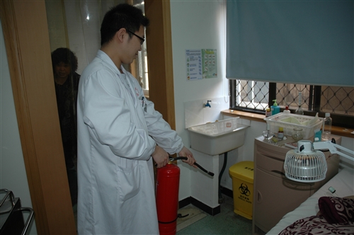 消防安全演练地点设置在医院国际保健康复中心一楼针灸室,演练过程为病人在诊疗室内吸烟造成火灾,随后医护人员按演练流程紧急疏散病人并拨打报警电话,同时全科室启动火灾应急预案,科主任指挥灭火组扑救初期火灾、疏散组对人员、物资进行疏散。待消防队到达后,医务人员全部转入人员、物资疏散组进行撤离。
