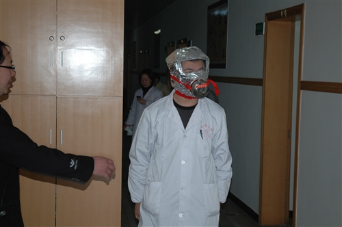 图为保卫科长为科室成员演示防毒面具的佩带方法