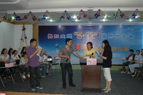 晚会的《趣味知识竞答》擂台大PK,内容涉及古今中外、包罗万象,涵盖了音乐、体育、军事、文学、地理、常识等等, 10个团队紧张有序地进行角逐,最终决出名次,九病区、二病区、三病区分别获得前三名,叶永利护士荣获“最佳答题手”。晚会当中还穿插了一些精彩的游戏环节,医护人员密切配合,进行良好互动,整个晚会高潮迭起,欢声笑语不断。