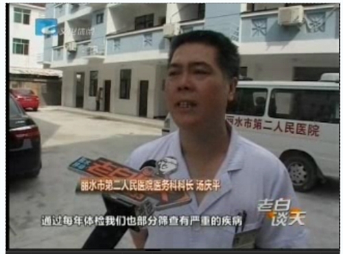 丽水市第二人民医院医务科科长汤庆平 我们这个石牛点大概已经做了七八年了, 通过每年体检我们也部分筛查有严重的疾病,我们也到建议及时到医院进行干预,我们这个支农工作这几年下来效果比较理想,而且这个体检我们都(只能)是利用节假日,因为我们平时医院工作也比较忙