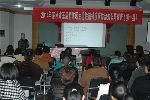 为切实提高我市基层精防医生的精神卫生知识水平,更好地完成《重性精神疾病管理治疗工作规范》的相关任务和要求,市精神卫生办公室决定与丽水市第二人民医院合作,于2014年2月24-28日、3月10-14日、3月24-28日举办三期面向全市各县(市)区的社区\乡镇卫生院精防医生的重性精神疾病防治知识培训班,培训内容:1、精神病症状学;2、重性精神疾病的识别与诊断;3、重性精神疾病的治疗与常见副反应;4、重性精神疾病患者的社区管理。学员们上午在精神科专科病房见习,下午进行理论学习。