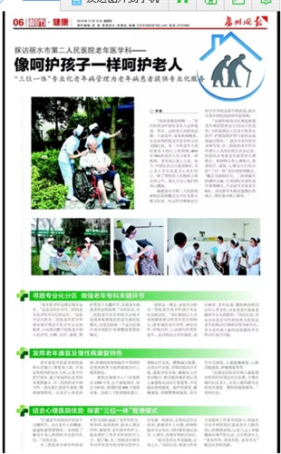 11月10日,《处州晚报》第6版整版报道我院老年医学科,以《“三位一体”专业化老年病管理为老年病患者提供专业化服务》为题,分别由“寻路专业化分区 做强老年专科关键环节”、“发挥老年康复及慢性病康复特色”、“结合心理医院优势 探索“三位一体”管理模式”三个板块展开。下文为《处州晚报》整版原文。 记者□ 李倩寻路专业化分区 做强老年专科关键环节 “ 老年医学科也要实现专业化。”这是吴绍长对市二医院老年医学科开诊后的定位。“全面开诊后的市二医院老年医学科将有望实现老年医学专业化的探索,从而带动整个医院老年病人的评估、诊断、治疗、康复、照护等各个关键环节,实现老年病患者的全程管理。”吴绍长说,市二医院老年医学科的开诊绝不是简单复制现有的老年病医院模式,而是在探索一个适合区域内老年病医疗发展整体需要的模式。 “打通老年疾病治疗的各个关键环节,关注老年人的健康,就意味着需要拥有一支细致了解老年身心疾病的专业医疗队伍。”吴绍长说。 市二医院老年病专科的老年医学团队涵盖了老年科医生、营养师、临床药师、临床心理治疗师、康复师、老年病专科护士、临床照护工等多学科的医疗人才。据了解,市二医院老年病专科对所有老年医学相关医护人员有着一致要求:必须经过专业培训,掌握老年人生理、病理和临床专业知识,同时要具备社会学、心理学、伦理学等相关知识。 “丽水是养生养老福地,长寿之乡。”吴绍长说,希望与所有为老服务工作者共同奋斗,将丽水市老年病医院打造成老年人颐养身心的理想家园,让老人过上幸福健康有尊严的生活,为实现老年人“老有所养、老有所医、老有所乐”做出应有的贡献。