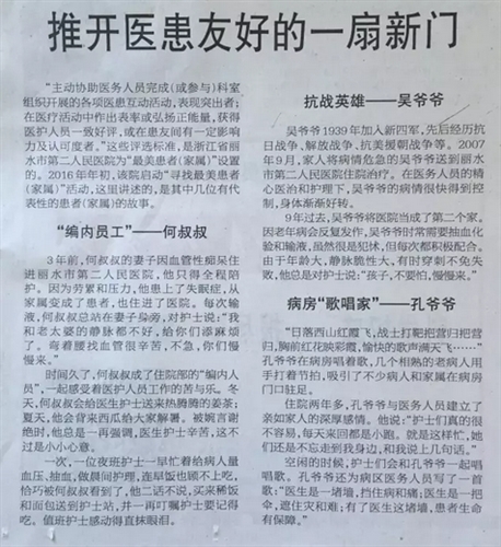 11月10日,《健康报》第3版报道了我院“最美患者(家属)”的系列活动,以《推开医患友好的一扇新门》为题,讲述了其中几位有代表性的患者(家属)的故事。下文为《健康报》整版原文。□通讯员 郑纯胜 叶菊芬 本报记者 李水根□推开医患友好的一扇新门 “主动协助医务人员完成(或参与)科室组织开展的各项医患互动活动,表现突出者;在医疗活动中作出表率或弘扬正能量,获得医护人员一致好评,或在患友间有一定影响力及认可度者。”这些评选标准,是浙江省丽水市第二人民医院为“最美患者(家属)”设置的。2016年年初,该院启动“寻找最美患者(家属)”活动,这里讲述的,是其中几位有代表性的患者(家属)的故事。 “编内员工”——何叔叔 3年前,何叔叔的妻子因血管性痴呆住进丽水市第二人民医院,他只得全程陪护。因为劳累和压力,他患上了失眠症,从家属变成了患者,也住进了医院。每次输液,何叔叔总站在妻子身旁,对护士说:“我和老太婆的静脉都不好,给你们添麻烦了。弯着腰找血管很辛苦,不急,你们慢慢来。”时间久了,何叔叔成了住院部的“编内人员”,一起感受着医护人员工作的苦与乐。冬天,何叔叔会给医生护士送来热腾腾的姜茶;夏天,他会背来西瓜给大家解暑。被婉言谢绝时,他总是一再强调,医生护士辛苦,这不过是小小心意。一次,一位夜班护士一早忙着给病人量血压、抽血,做晨间护理,连早饭也顾不上吃,恰巧被何叔叔看到了,他二话不说,买来稀饭和面包送到护士站,并一再叮嘱护士要记得吃。值班护士感动得直抹眼泪。抗战英雄——吴爷爷 吴爷爷1939年加入新四军,先后经历抗日战争、解放战争、抗美援朝战争等。2007年9月,家人将病情危急的吴爷爷送到丽水市第二人民医院住院治疗。在医务人员的精心医治和护理下,吴爷爷的病情很快得到控制,身体渐渐好转。9年过去,吴爷爷将医院当成了第二个家。因老年病会反复发作,吴爷爷时常需要抽血化验和输液,虽然很是犯怵,但每次都积极配合。由于年龄大,静脉脆性大,有时穿刺不免失败,他总是对护士说:“孩子,不要怕,慢慢来。”病房“歌唱家”——孔爷爷 “日落西山红霞飞,战士打靶把营归把营归,胸前红花映彩霞,愉快的歌声满天飞……”孔爷爷在病房唱着歌,几个相熟的老病人用手打着节拍,吸引了不少病人和家属在病房门口驻足。住院两年多,孔爷爷与医务人员建立了亲如家人的深厚感情。他说:“护士们真的很不容易,每天来回都是小跑。就是这样忙,她们还是不忘走到我身边,和我说上几句话。”空闲的时候,护士们会和孔爷爷一起唱唱歌。孔爷爷还为病区医务人员写了一首歌:“医生是一堵墙,挡住病和痛;医生是一把伞,遮住灾和难;有了医生这堵墙,患者生命有保障。”