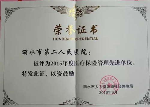 在刚刚结束的2016年医疗保险管理工作会议上,我院因2015年度医保工作完成优异被丽水市人力资源和社会保障局评为:2015年“医疗保险管理工作先进单位”及2015年度“A级定点医疗机构”。