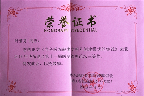 4月21日,“2016年华东地区第十一届医院管理论坛”在杭州召开,华东地区六省一市二、三级医院领导及相关部门负责人共计700余人参加会议。本次论坛的主题是:医改.质量.安全,并以此开展征文活动,大会共收到论文815篇,经评选,共有143篇论文分别获评三等奖至特等奖,我院院办主任叶菊芬撰写的《专科医院敬老文明号创建模式的实践》一文荣获三等奖。