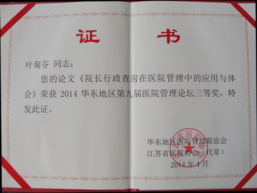 日前,2014年华东地区第九届医院管理论坛在江苏徐州召开,本届论坛主题为“改革.管理.质量”,来自华东六省一市的医院管理者围绕深化公立医院改革、医院管理等内容进行深入探讨交流。论坛还表彰了本年度优秀论文,我院叶菊芬撰写《院长行政查房在医院管理中的应用与体会》一文荣获三等奖。
